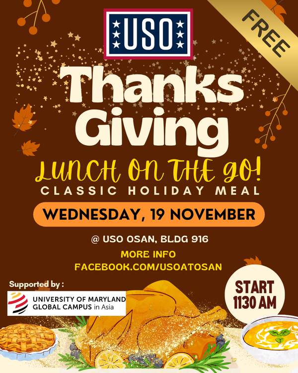 For many in our military community, the holiday season can be a reminder of the distance from family and home. To bring warmth and togetherness during this time, USO Osan is hosting a Thanksgiving-style lunch for service members and their families, filled with classic holiday flavors and the feeling of gathering around a shared family table—only this time, the family is our entire USO community. A special thank-you to UMGC and Navy Federal Credit Union for their generous in-kind donations that help make this holiday meal even merrier for our military community.