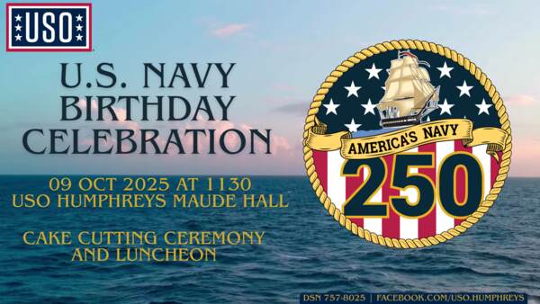 🎉⚓ Happy 250th Birthday, U.S. Navy! ⚓🎉 Join us at USO Humphreys Maude Hall on Thursday, October 9, 2025, as we honor 250 years of Navy excellence, tradition, and service! Event Highlights: 🎙️ Opening Remarks 🎂 Cake Cutting Ceremony – Celebrate this historic milestone with a time-honored Navy tradition. 🌮 Build-Your-Own Taco & Burrito Bar – Customize your plate with all your favorite fixings! 📍 Location: USO Humphreys Maude Hall 🕙 Time: 1130 Whether you’re Navy, a proud supporter, or just love tacos—this celebration is for YOU! Come out and help us make this birthday one to remember. 💙