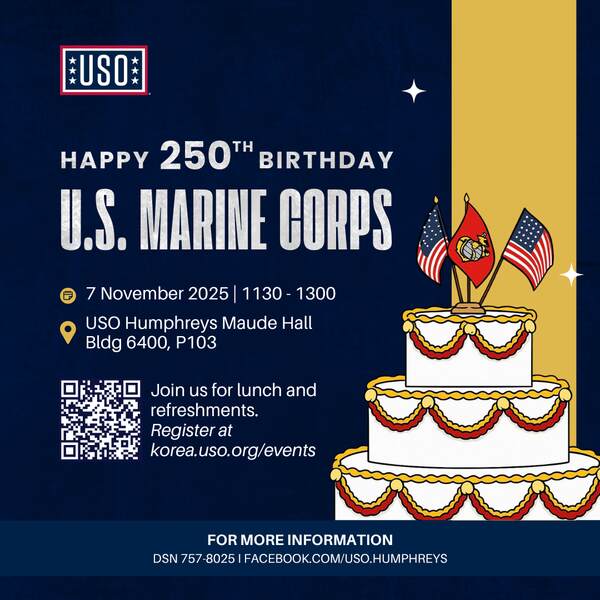 🎉 Happy 250th Birthday, U.S. Marines! 🎉 Join us at USO Humphreys Maude Hall on Friday, November 7, 2025, as we honor 250 years of the US’s premiere fighting force! Event Highlights: 🎙️ Opening Remarks 🎂 Cake Cutting Ceremony – Celebrate this historic milestone with a time-honored tradition. 🎉 Lunch (Burgers and Brats) 📍 Location: USO Humphreys Maude Hall 🕙 Time: 1130 Come out and help us make this birthday one to remember. 💙
