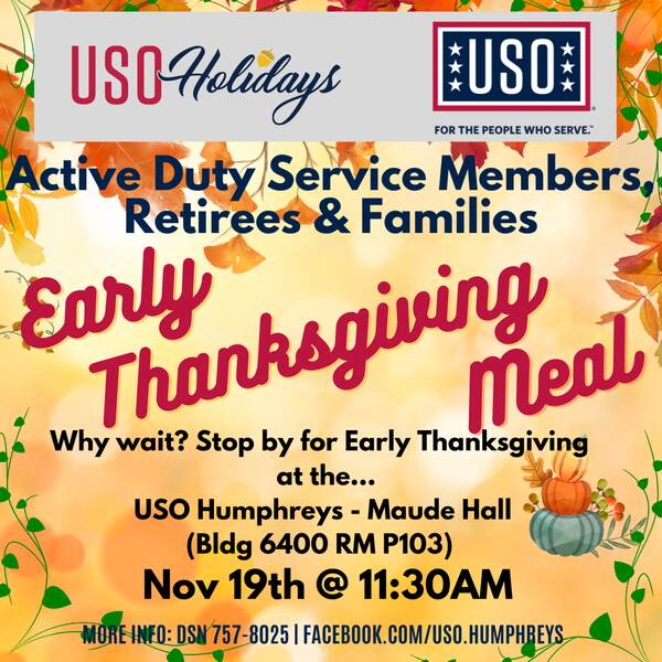 Stop by and join us for an early Thanksgiving Feast at USO Humphreys Maude Hall.
