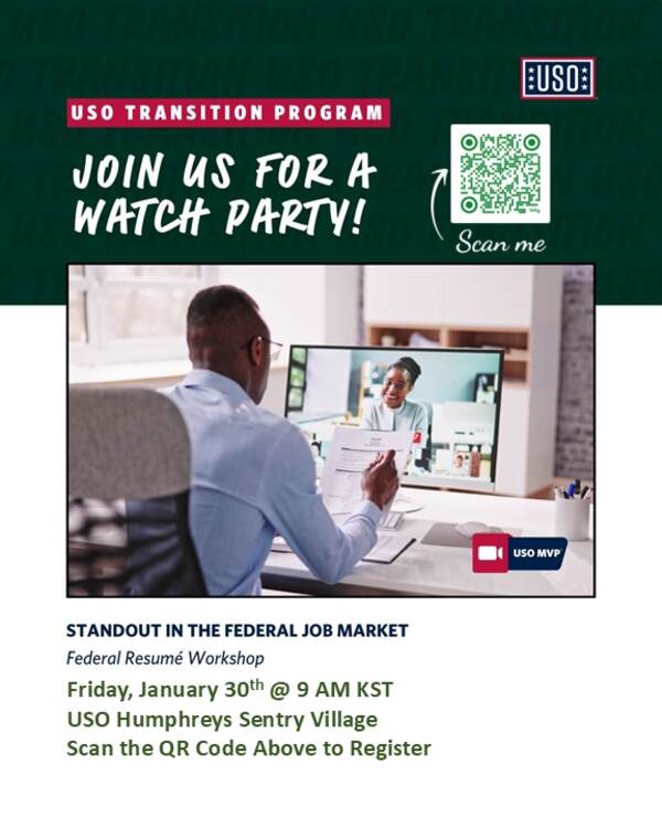 Join us for a watch party where the USO will live-stream the “Building a Federal Resume” workshop. Learn how to build a Federal Resume and navigate USAJobs to find a career that matches your interests and skills.