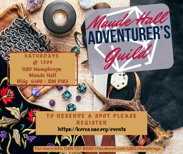 In a realm where magic and mystery intertwine, where heroes rise from the humblest of origins to face unimaginable challenges, an epic journey awaits. From the depths of ancient dungeons to the heights of towering citadels, they will journey across realms both wondrous and perilous, forging their own legends with every step they take. But beware, for lurking in the shadows are forces that seek to thwart their every move. Dark sorcery, sinister plots, and ancient evils threaten to consume the world in darkness. Yet hope shines brightest in the darkest of hours, and heroes are born in the crucible of adversity. For in this world, destiny favors the bold. “Are you ready to embark on your adventure?” Great for beginners and more seasoned players. Registration Required! (This event is for Mature audiences.) For Youth Events, please watch for Youth D&D events at USO Humphreys Sentry Village Bldg 301.