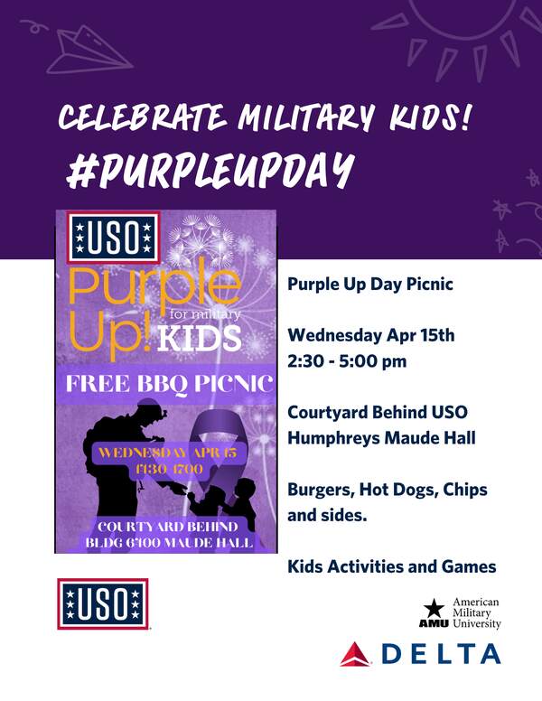 Come Join us as we celebrate Military Kids! In honor of Purple Up Day, we will host a Purple Up Picnic on Wednesday April 15th starting at 1430. The event will be in the courtyard behind USO Humphreys Maude Hall and run until 1700. Stop by, Grab a burger or dog with a selection of sides, enjoy some games, activities, and visit your friends from the community. #PURPLEUP REGISTRATION NOT REQUIRED but appreciated. Hope to see you there!!