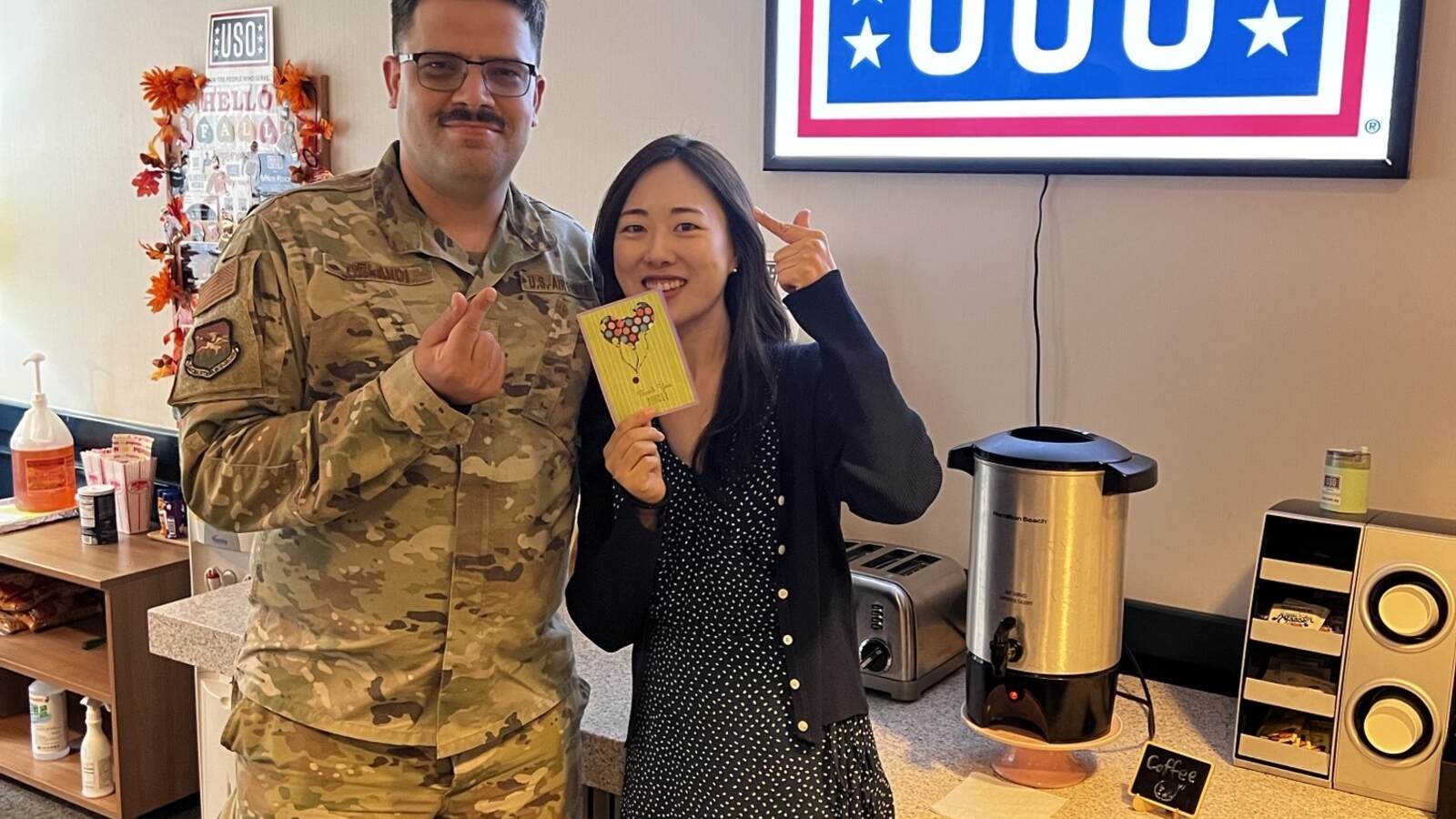 A Lost Phone, a Lot of Determination — and a Touch of USO Magic At the USO, we often say we’re here to keep service members connected — and sometimes, that mission becomes literal. On August 28, Marine Cpl. Bell departed Osan Air Base after completing his TDY assignment. Shortly after arriving in Japan, he realized his cellphone had gone missing — left behind in a base taxi in Korea. With critical personal information and contacts on the device, he reached out to the USO Osan team on September 1, sending an email with the subject line: “Lost my phone in taxi – Need a miracle.” Sunny, our dedicated USO Osan Center Operations Manager, immediately got to work. She contacted the base taxi company the same day, located the missing phone, and picked it up to secure it at the USO. Getting the phone back to its owner, however, turned out to be more complex than expected. Due to international regulations on shipping items with lithium batteries, mailing the phone to Camp Foster, Japan was not possible. FedEx and USPS both declined delivery to Japan, and the U.S. post office could only process the package if it was shipped stateside via ground. Rather than giving up, the Osan team found a solution: since Cpl. Bell would soon rotate back to the United States, we would ship the phone directly to his home address to ensure it reached him safely. A special thank-you goes to active-duty Air Force volunteer William Orlandi, who assisted Sunny by researching every possible FedEx and USPS option — one more example of how volunteers make the USO mission possible. (William has logged an incredible 2,148 lifetime volunteer hours with the USO!) On September 9, before the phone even arrived, Cpl. Bell took time to stop by USO Camp Foster and send a video message expressing his appreciation to the USO Osan team. Then on September 23, our team received a handwritten thank-you card from him — a small gesture that meant so much.