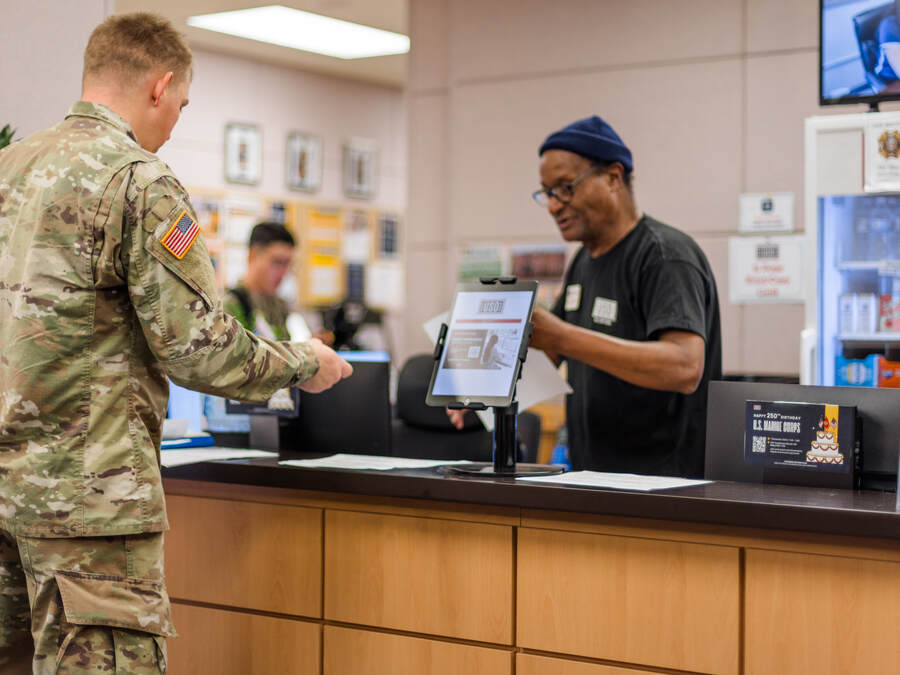 Soldiers stop by the USO Humphreys Maude Hall Center for a moment of calm during in-processing, out-processing, or other busy days at the one-stop processing center. Dedicated volunteers like Charles (pictured at the desk) ensure each visitor feels supported and welcomed with a friendly smile. | Photo credit Photo by Allyssa Bengson.