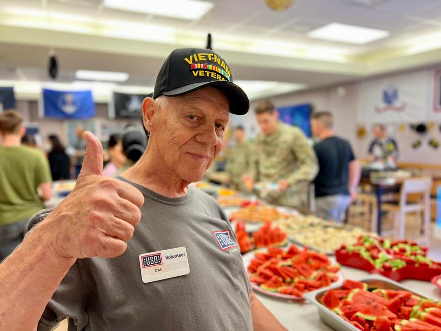 Special events such as Armed Services birthdays bring the community together in camaraderie and celebration. Volunteers like Dan (pictured at a U.S. Army birthday event) play an essential role in preparing and serving food for the crowds at these gatherings. | Photo credit Photo by Sara Jung